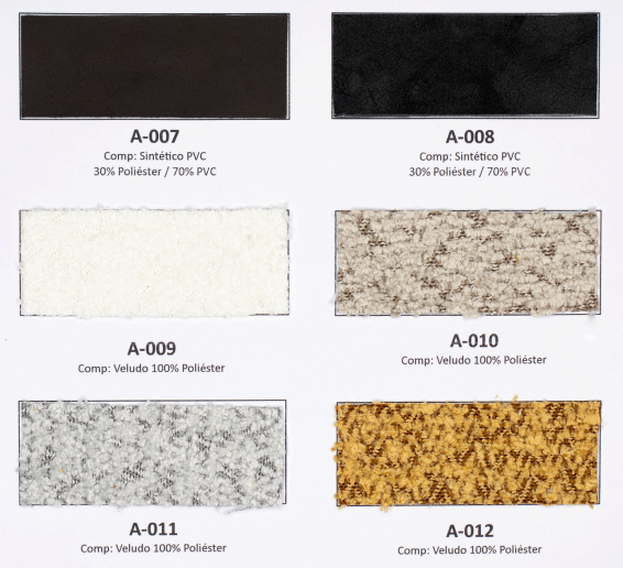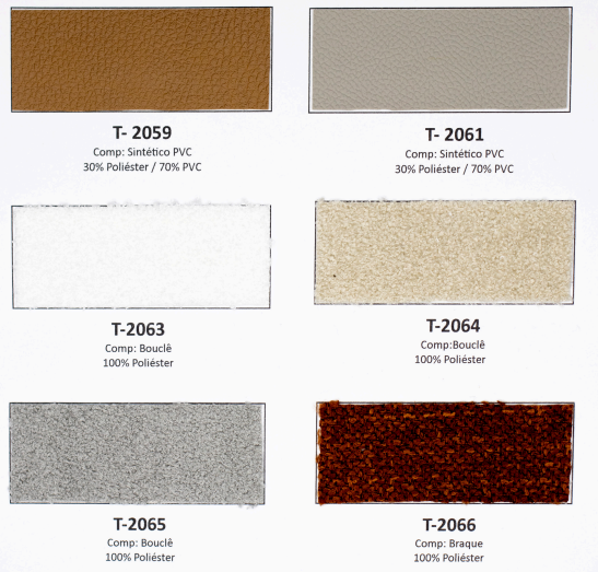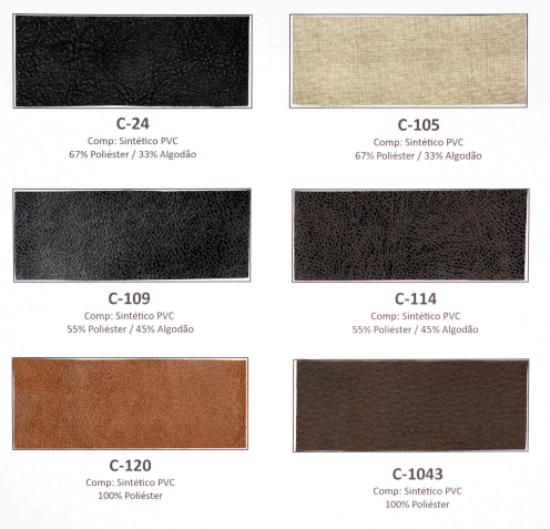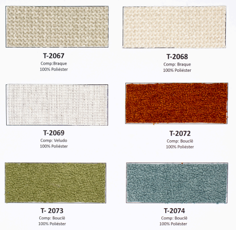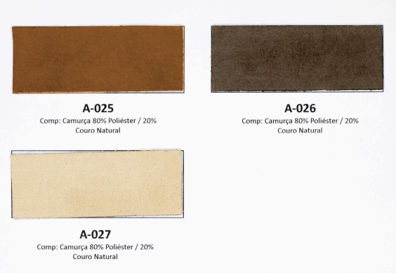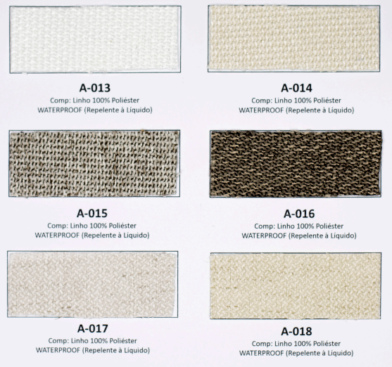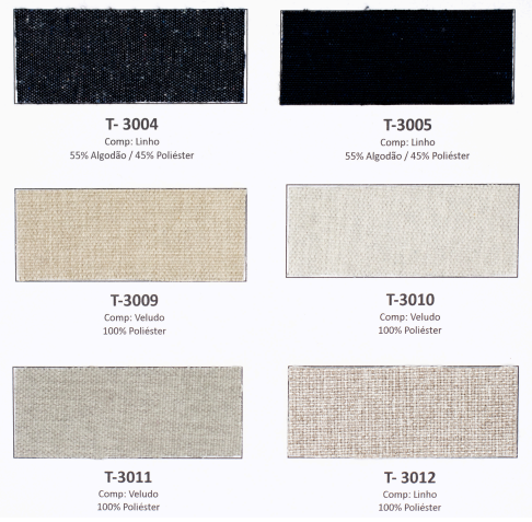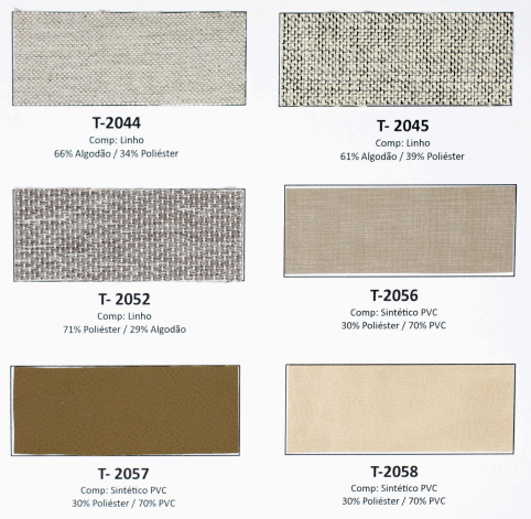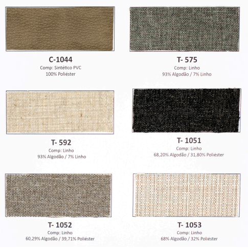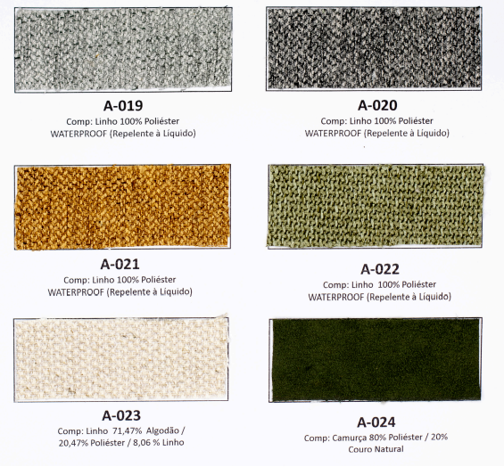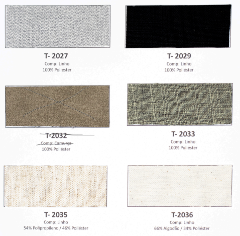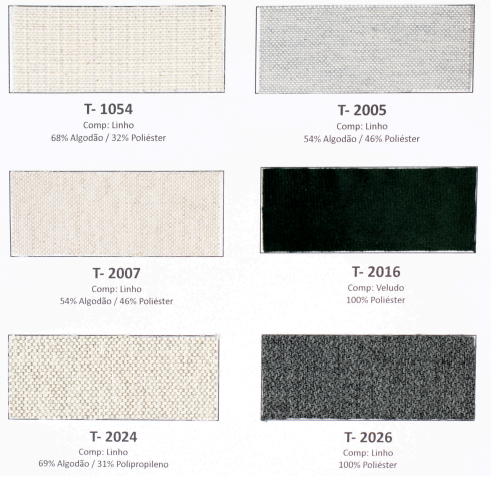 Tecidos e acabamentos disponíveis no anexo.