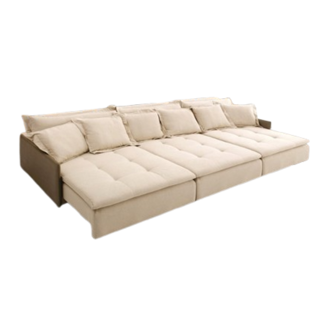Percinta elástica Italiana trançada e tencionada com molas Bonnel entrelaçadas. Assento retrátil com alongadores no sistema tubolar, que se transforma em chaise longue, e pilow top em espuma d-28 soft com camadas de manta acrílica siliconada. Encosto com almofadas soltas em fibra de silicone e camadas de manta acrílica siliconada. Braço conforme foto com 6 cm em espuma d-23 soft. Pés em madeira com 3,5 cm de altura.